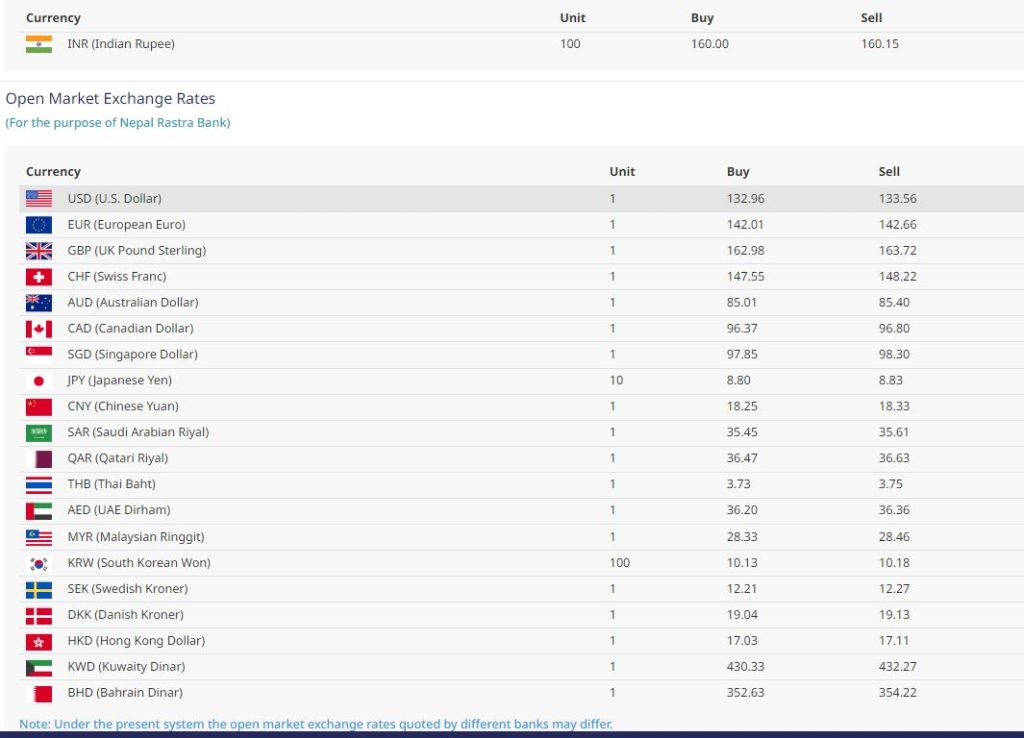 राष्ट्र बैंकले आजका लागि अमेरिकी डलरको १ को खरिद दर १३२ रुपैयाँ ९६ पैसा र बिक्री दर १३३ रुपैयाँ ५६ पैसा कायम गरेको छ भने युरोपियन युरो एकको खरिद दर १४२ रुपैयाँ ०१ पैसा र बिक्री दर १४२ रुपैयाँ ६६ पैसामा कारोबारको अनुमति दिएको छ ।