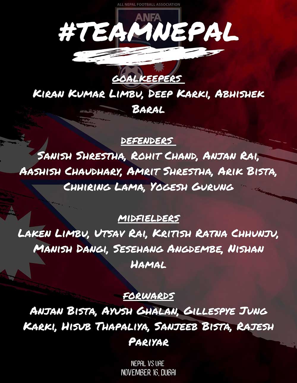 गोलकिपर: किरण चेम्जोङ (कप्तान), दिप कार्की र अभिषेक बराल।
