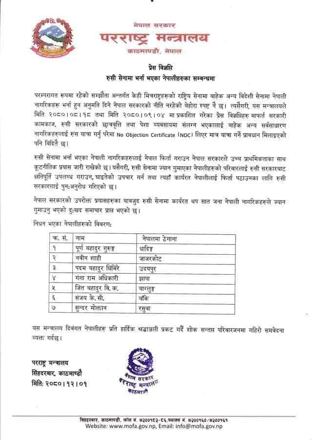 मित्र राष्ट्रहरुको राष्ट्रिय सेनामा बाहेक अन्य देशको सेनामा नेपाली नागरीक भर्ती हुन नपाइने प्रावधान रहेकोले स्वदेश फर्काउन कूटनीतिक प्रयास भएरहेका बेला रुसमा थप नेपाली नागरिकको निधन भएको प्रति सरकारले दुख व्यक्त गरेको छ ।