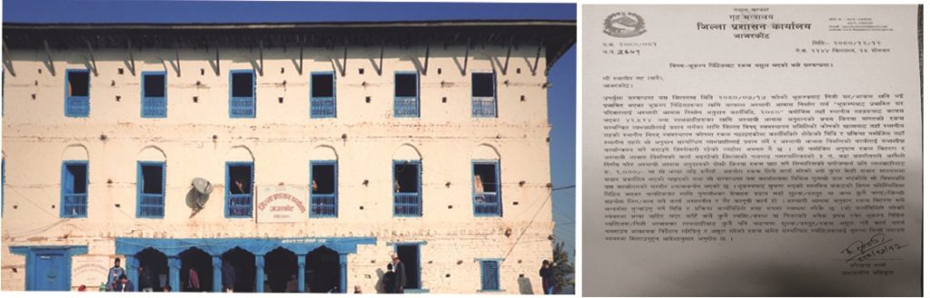 नलगाड नगरपालिकाको ३ नं. वडाले स्वास्थ्य चौकी र शिक्षाको भवन बनाउने भन्दै भूकम्प पीडित बाट एक हजार पैसा लिईरहेको प्रति प्रशासनले गम्भीर ध्यानाकर्षण भएको जनाएको छ । सहायक प्रमुख जिल्ला अधिकारी हरिश्चन्द्र शर्मालेद्धारा हस्ताक्षर गरिएको विज्ञप्तीमा भनिएको छ, ‘अस्थायी आवास अनुदान रकम वितरण गर्ने सन्दर्भमा पुर्याउनु पर्ने विधि र प्रक्रिया कार्यविधिले स्पष्ट रुपमा व्याख्या गरेकै छ ।