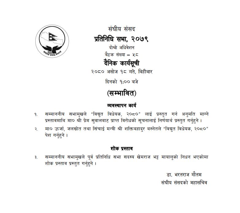 सङ्घीय संसद् सचिवालयले सार्वजनिक गरेको सम्भावित कार्यसूची अनुसार ऊर्जा, जलस्रोत तथा सिँचाइ मन्त्री शक्तिबहादुर बस्नेतले बिधुत विधेयक २०८० पेस गर्नेछन् ।