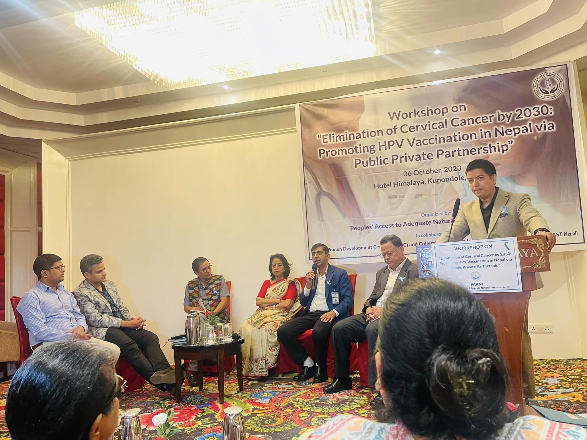 आश्विन १९ गते होटेल हिमालयन, कुपण्डोलमा पिपुल्स एक्सेस टू एडिक्योट नेचुरल इन्फ्रास्ट्रक्चर्स (पानी)ले सन् २०३० सम्ममा पाठेघरको मुखको क्यान्सर उन्मुलन गर्ने लक्ष्य र सार्वजनिक निजी साझेदारी मार्फत पाठेघरको मुखको क्यान्सर विरुद्धको खोपको पर्वद्धन विषयक कार्यशाला गोष्ठीमा वरिष्ठ क्यान्सर रोग विशेषज्ञ डा.अरुण शाहीले ‘क्यान्सर लाग्नै नदिनु सबैभन्दा महत्त्वपूर्ण कुरा भएको’ बताउँदै – ‘क्यान्सर गराउने भाइरस विरुद्ध ९ देखि १५ वर्ष मुनिका बालबालिकाहरूलाई खोप दिन सकियो भने भविष्यमा पाठेघरको मुखको क्यान्सर हुने सम्भावनालाई ९० प्रतिशतले कम गर्न सकिने’ बताए ।