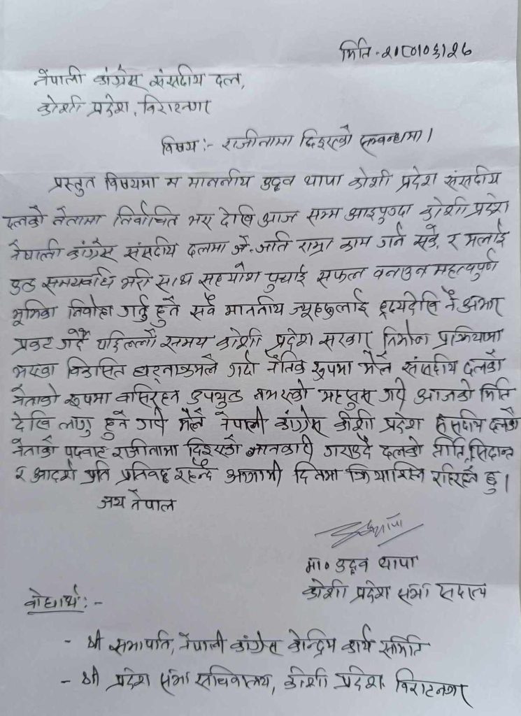नेपाली काँग्रेस कोसी प्रदेशका संसदीय दलका नेता उद्धव थापाले दलको नेताबाट राजीनामा दिएका हुन । उनी यसअघि दुई दुई पटक मुख्यमन्त्रीमा नियुक्त भए पनि सर्वोच्च अदालतले उनलाई दुवै पटक बर्खास्त गरेको थियो ।