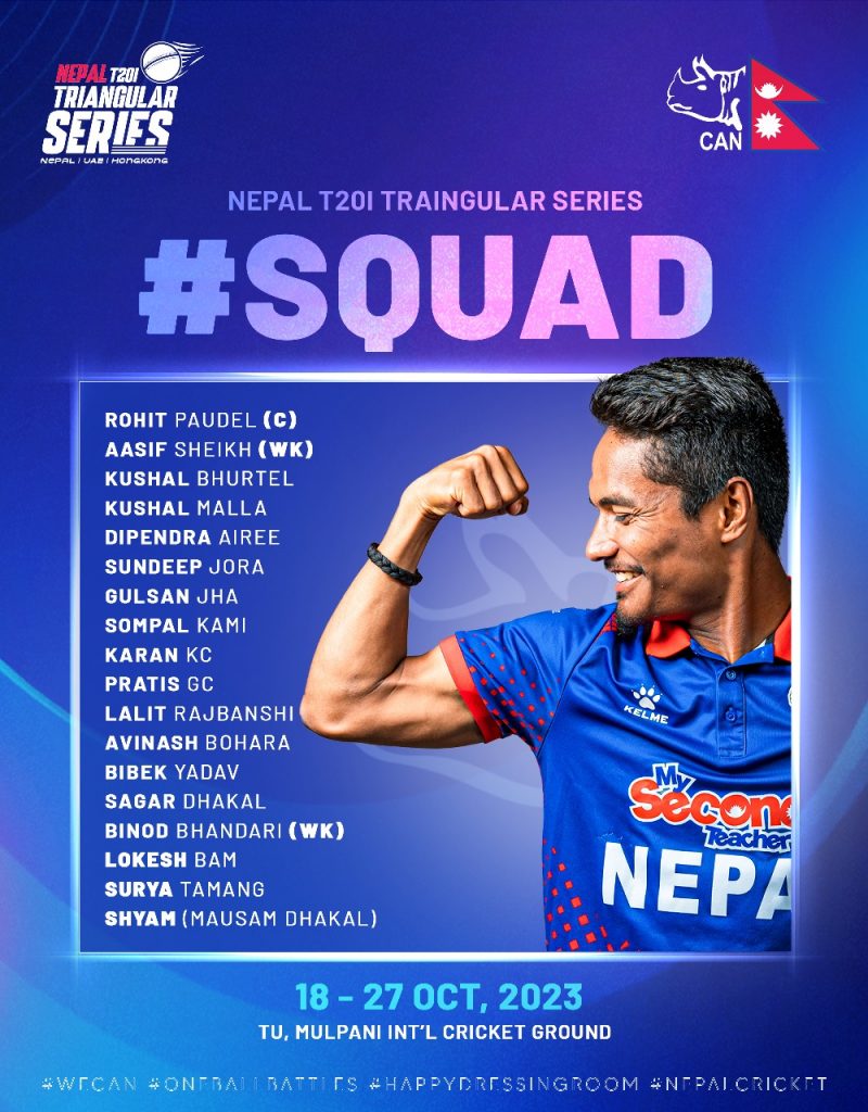 रोहित पौडेलको कप्तानीमा १८ सदस्यीय नेपाली टोली घोषणा गरिएको हो । टोलीमा सोमपाल कामी, करण केसी, गुल्सन झा, सन्दीप जोरा, कुशल भुर्तेल, कुशल मल्ल, विनोद भण्डारी, सागर ढकाल, लोकेश बम, सूर्य तामाङ, श्याम ढकाल, प्रतीश जिसी, दीपेन्द्रसिंह ऐरी, आसिफ शेख, विवेक यादव, ललितनारायण राजवंशी र अविनाश बोहरा छन् ।