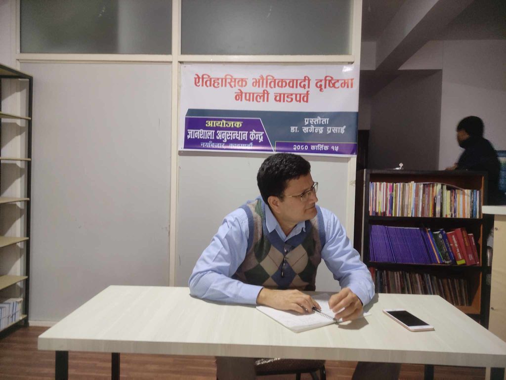 काठमाडौँ, कार्तिक १६ गते । ‘धर्म र चाडपर्वलाई ऐतिहासिक भौतिकवादी दृष्टिकोणबाट नहेर्दा, अन्धविश्वास भनेको सामन्तवाद र विज्ञान भनेको पुँजीवाद हो भन्ने गलत निष्कर्षमा पुगिने’ दर्शनशास्त्री डा.खगेन्द्र प्रसाईँले बताए । ज्ञानशाला अनुसन्धान केन्द्रले कार्तिक १५ गते नयाँबजार स्थित अनुसन्धान केन्द्रको सेमिनार हलमा आयोजित अन्तरक्रिया कार्यक्रममा उनले सो धारणा बताएका हुन् ।