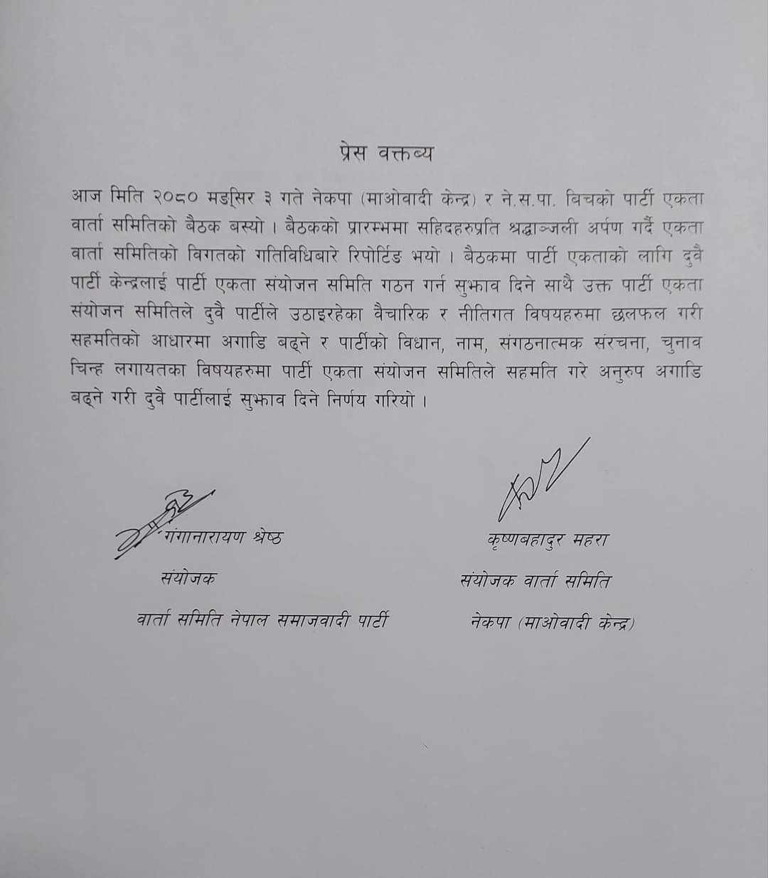 माओवादी केन्द्र वार्ता समिति संयोजक कृष्णबहादुर महरा र नेपाल समाजवादी पार्टी वार्ता समिति संयोजक गंगानारायण श्रेष्ठले बैठकपछि जारी गरेको विज्ञप्ति :