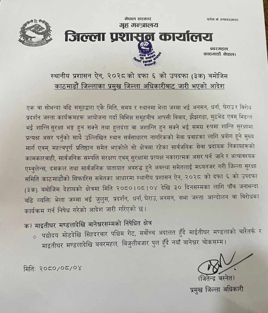 काठमाडौंका प्रमुख जिल्ला अधिकारी जितेन्द्र बस्नेतले मंसिर ४ देखि ३० दिनसम्मका लागि माइतीघरदेखि नयाँ बानेश्वरसम्मको क्षेत्रलाई निषेधित क्षेत्र घोषणा गरेका हुन् ।
