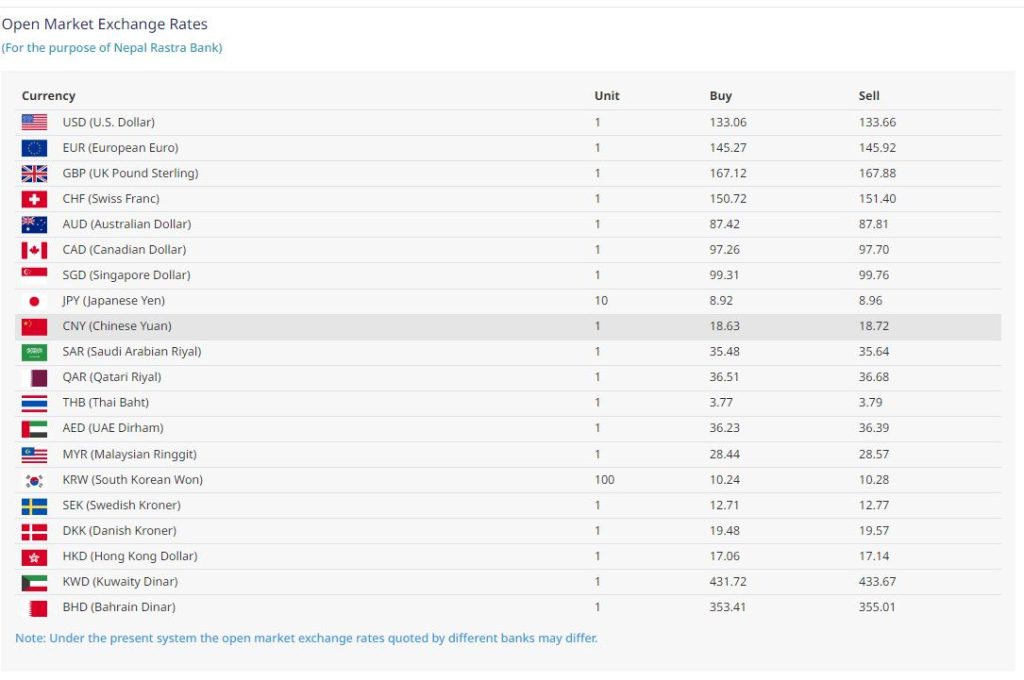 राष्ट्र बैंकले आजका लागि अमेरिकी डलरको १ को खरिद दर १३३ रुपैयाँ ०६ पैसा र बिक्री दर १३३ रुपैयाँ ६६ पैसा कायम गरेको छ भने युरोपियन युरो एकको खरिद दर १४५ रुपैयाँ २७ पैसा र बिक्री दर १४५ रुपैयाँ ९२ पैसामा कारोबारको अनुमति दिएको छ ।