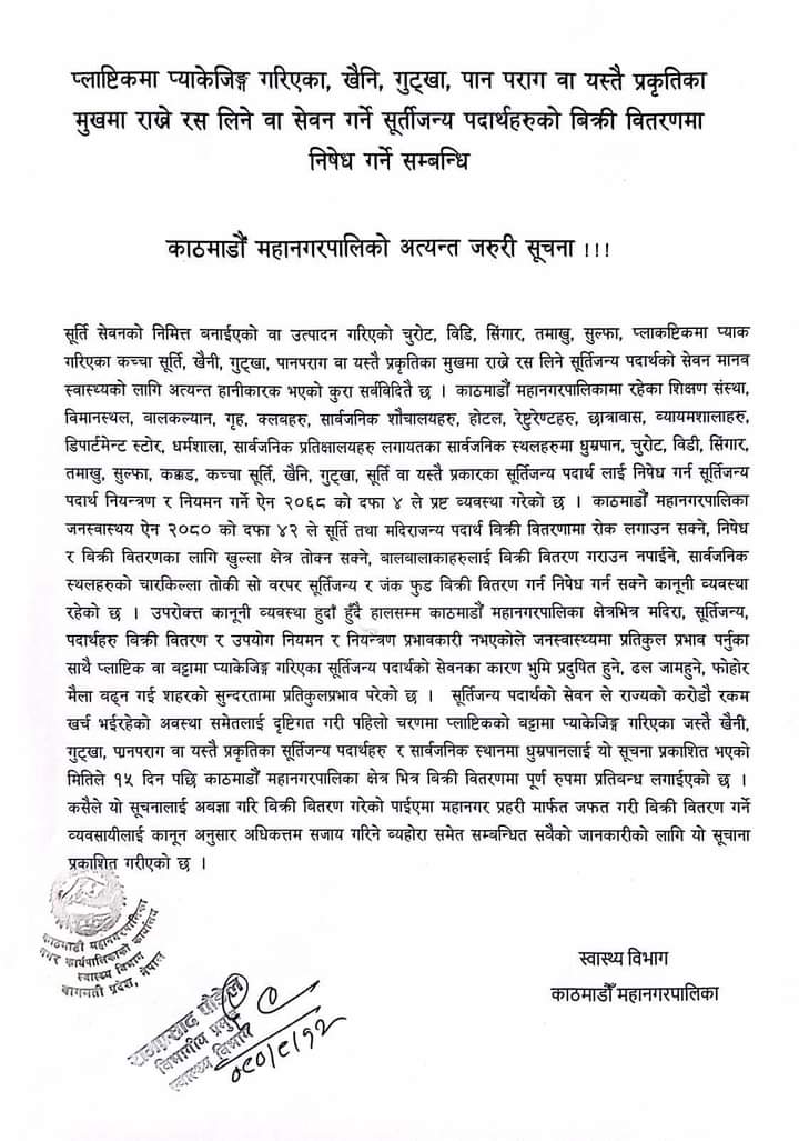 एक सूचना जारी गर्दै महानगरको स्वास्थ्य विभागले १५ दिन अवधि अर्थात आगामी २७ गतेदेखि यो नियम लागू हुने उल्लेख छ। सुर्तीजन्य पदार्थ जस्तै चुरोट, बिडी, सिगार, तमाखु, सुल्फा, कक्कड, प्लास्टिकमा प्याक गरिएका कच्चा सुर्ती, खैनी, गुटखा, पानपरागलगायतका पदार्थ कसैले बिक्री गरेको पाइएमा नगर प्रहरीले सामान जफत गर्ने छ।
