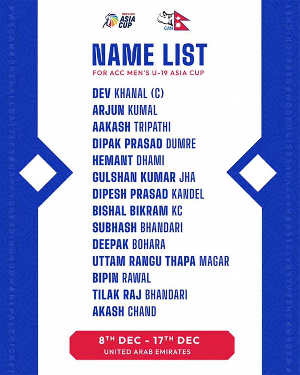 १३ मंसिर,काठमाडौं । एसीसी यू-१९ एसिया कप खेल्ने नेपाली टिमको घोषणा गरिएको छ । नेपाल क्रिकेट संघ (क्यान) ले यू-१९ एशिय कप खेल्ने नेपाली १४ सदस्यीय टिमको घोषणा गरेको हो । देव खनालको कप्तानीमा घोषणा गरिएको नेपाली टिममा सिनियर टिमका गुलशन झालाई समावेश गरिएको छ ।