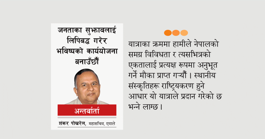 एमालेले १४ मंसिरमा बैतडीको झुलाघाटबाट सुरु गरेको १९ दिने मध्यपहाडी संकल्प यात्रा १ पुसमा पाँचथरको चिवाभन्ज्याङमा पुगेर समापन भएको छ । यात्राको क्रममा अध्यक्ष केपी ओलीमाथि आक्रमण प्रयाससमेत भयो । यसै पृष्ठभूमिमा एमालेको ‘संकल्प यात्रा’, राष्ट्रिय राजनीति, सरकार, दलहरूले चलाइरहेको ‘मिसन ८४’लगायतका विषयमा महासचिव शंकरपोखरेलसँग नयाँ पत्रिकाका शुरोजंगपाण्डेले गरेको कुराकानी :