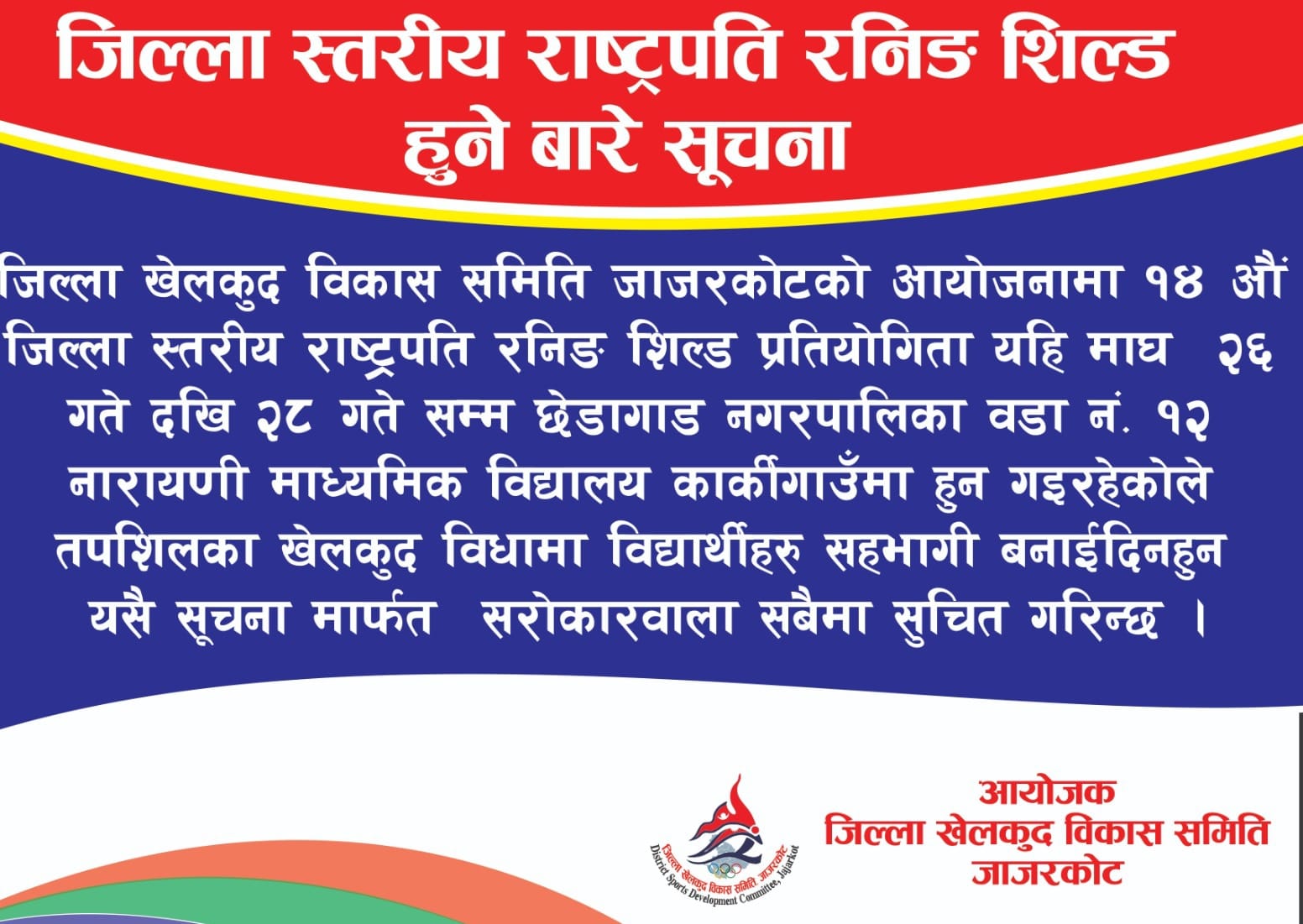 जाजरकोट । जिल्ला स्तरीय १४ औं राष्ट्रपति रनिङ शिल्ड प्रतियोगिता नारायाणी मावि कार्कीगाउँमा हुने भएको छ । गत वर्षको शिल्ड विजेता छेडागाड नगरपालिकाको वडा नंं. १२ स्थित नारायणी माविको खेल मैदानमा यस वर्षको जिल्ला स्तरीय राष्ट्रपति रनिङ शिल्ड प्रतियोगिता हुने भएको हो ।