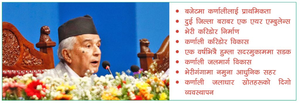 सुर्खेत । संघीय सरकारले सार्वजनिक गरेको नीति तथा कार्यक्रममा कर्णाली उच्च प्राथमिकतामा परेको छ । राष्ट्रपति रामचन्द्र पौडेलले प्रस्तुत गरेको नीति तथा कार्यक्रममा कृषिदेखि सडक पूर्वाधारले प्राथमिकता पाएको हो ।