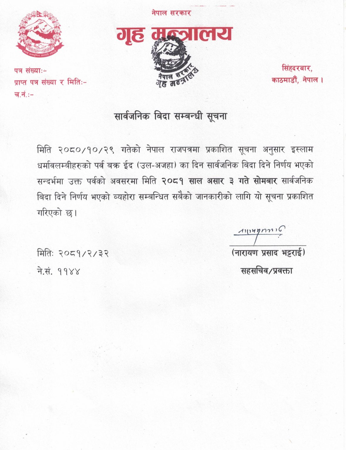 बक्र ईद (उलअजहा) का अवसरमा सरकारले असार ३ गते सोमबार सार्वजनिक बिदा दिने निर्णय भएको हो ।