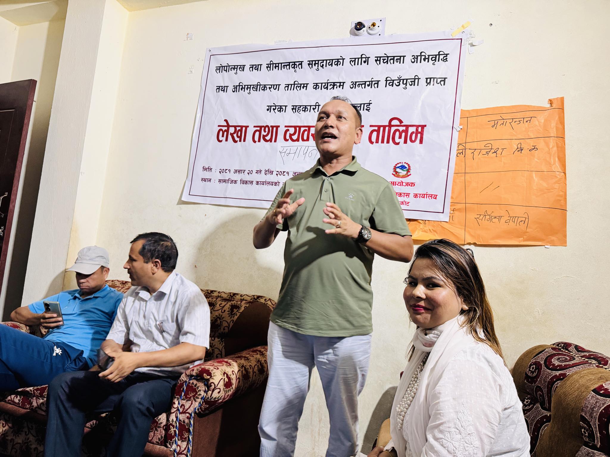 जाजरकोट । जिल्लाका विपन्न तथा सिमान्तकृत समुदाय संलग्न सहकारीहरुलाई लेखा तथा व्यवस्थापन तालिम दिइएको छ । सामाजिक विकास कार्यालयको लोपोन्मुख तथा सीमान्तकृत समुदायको लागि सचेतना अभिबृद्धि तथा अभिमूखिकरण तालिम कार्यक्रम अन्तरगत भिभिन्न १२ वटा सहकारीका अध्यक्ष, सचिव र कोषाध्यक्षहरुलाई ३ दिने लेखा तथा व्यवस्थापन तालिम दिइएको हो ।