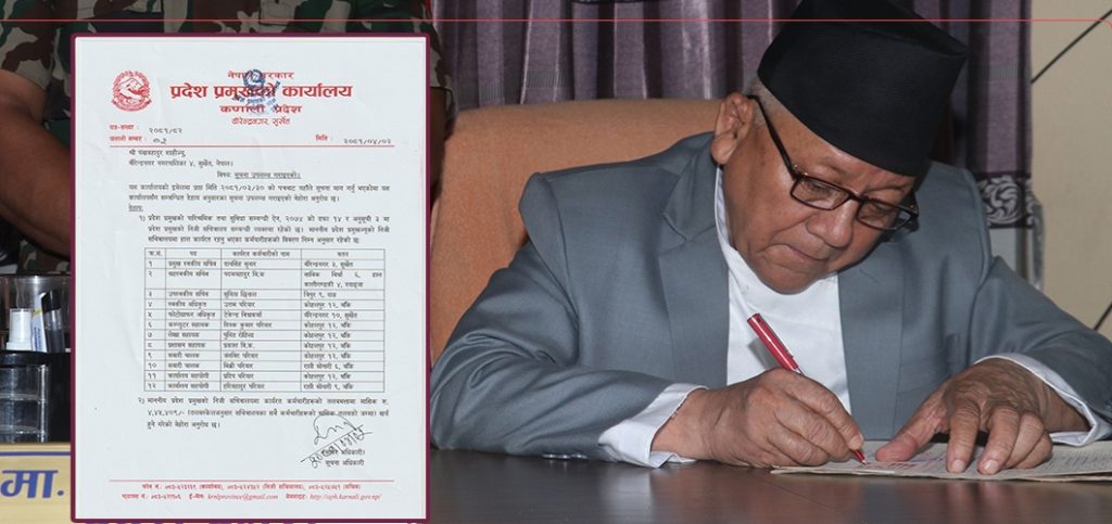 नेपालगञ्ज । कर्णाली प्रदेश प्रमुख तिलक परियारले आफ्नो सचिवालयमा १२ जनालाई नियुक्ति दिएकोमा अधिकांश आफ्नै परिवारका सदस्य रहेको खुलेको छ । ०७८ कार्तिकमा कर्णालीको प्रदेश प्रमुख नियुक्त भएका परियारले आफ्नो सचिवालयमा तीन छोरा, एक बुहारी, तीन नाति, एक भतिज र एक भान्जालाई नियुक्ति दिएका हुन् ।