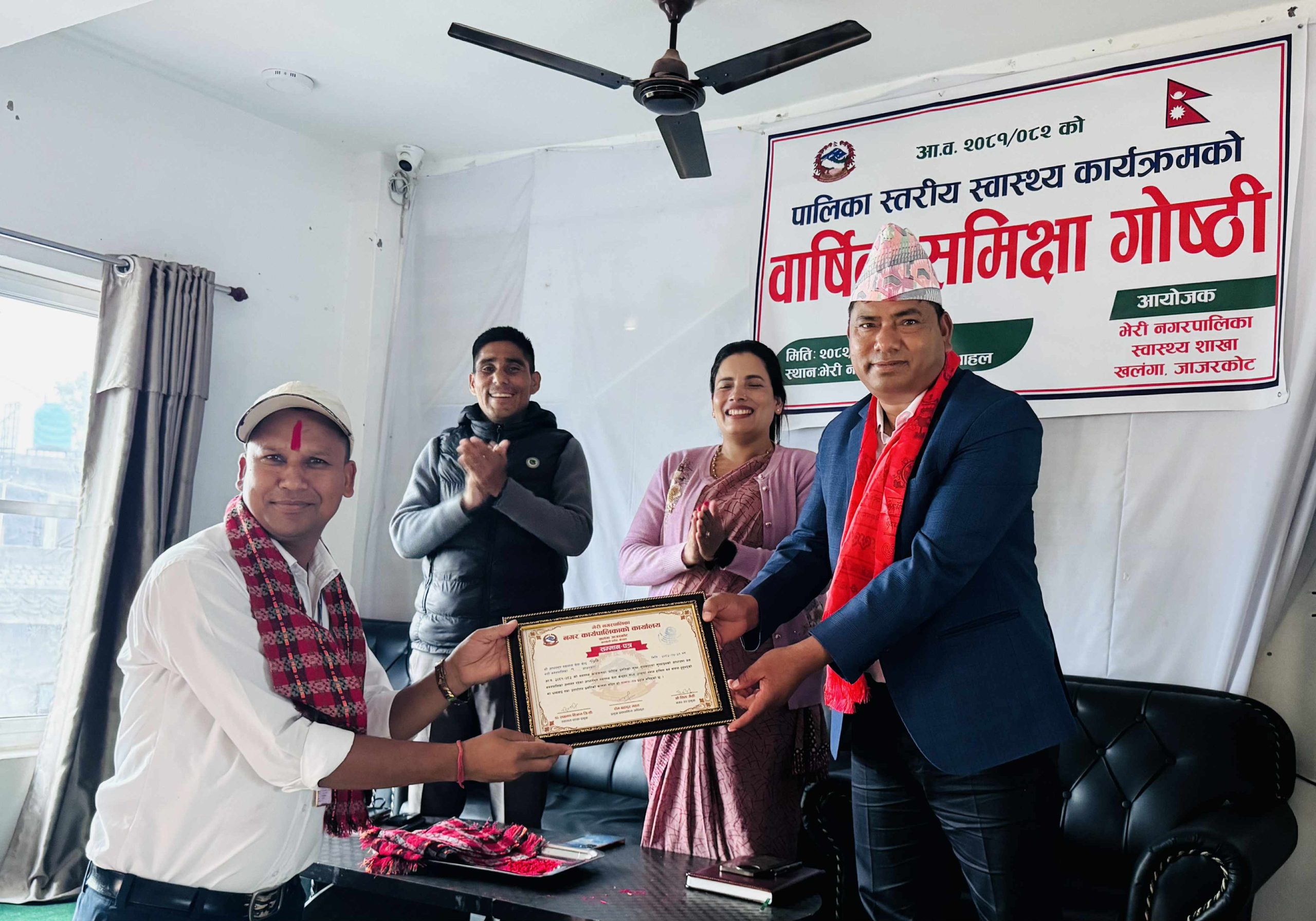 नगरपालिकाको स्वास्थ्य शाखाको आयोजनामा मंगलबार सम्पन्न आर्थिक वर्ष २०८१।८२ को पालिका स्तरिय वार्षिक समिक्षा गोष्ठीमा स्वास्थ्य चौकी भुरलाई उत्कृष्ट स्वास्थ्यचौकीका रुपमा सम्मान गरिएको छ । स्वास्थ्य क्षेत्रका विभिन्न सूचकहरुका आधारमा स्वास्थ्य चौकी तर्फ भुरले ८१.५५ प्रतिशत अंक प्राप्त गरेर प्रथम भएको नगरपालिकाका स्वास्थ्य शाखा प्रमुख डा. लक्ष्मण विक्रम जिसीले बताए । त्यसैगरी आधारभूत स्वास्थ्य केन्द्र तर्फ भेरी नगरपालिका १ स्थित पिपे आधारभूत स्वास्थ्य केन्द्र उत्कृष्ट भएको छ । पिपेले ६२.९९ प्रतिशत अंक प्राप्त गरेको शाखा प्रमुख जिसीको भनाई छ ।